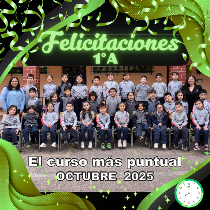 Durante el mes de octubre, el curso 1°A se destacó como el más puntual del Primer Ciclo Básico, demostrando un fuerte compromiso con su formación. La puntualidad es una muestra clara de respeto por el tiempo y el aprendizaje, además de fomentar la disciplina, el trabajo colaborativo y hábitos positivos que les servirán para toda la vida.